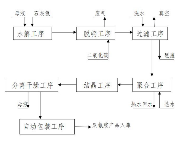 將水或母液打入攪拌罐,經(jīng)石灰氮磨細(xì)后定量均勻地加入配漿槽充分?jǐn)嚢瑁故业耆?,生成氰胺氰鈣液,再將水解液經(jīng)泥漿泵送入碳化塔,與來自石灰窯的經(jīng)過壓縮后進(jìn)入碳化塔的二氧化碳?xì)怏w(窯氣)完全接觸反應(yīng),完成石灰氮水溶液的脫鈣過程。將水解脫鈣反應(yīng)完成后的料液加入帶濾機(jī),將石灰氮中水解碳化的雜質(zhì)以及碳化過程中生成的碳酸鈣固體濾掉,得到純凈的單氰胺溶液;將單氰胺水溶液打入聚合鍋,經(jīng)蒸汽加熱至 70℃,并調(diào)整 PH 值為 10 左右,完成聚合過程,生成雙氰胺。再將雙氰胺水溶液放入抽濾桶,過濾掉聚合過程中生成的白灰等雜質(zhì),再經(jīng)硅藻土過濾機(jī)過濾得到純凈的雙氰胺溶液;將純凈的雙氰胺溶液打入結(jié)晶鍋,通過冷凍站來的低溫水雙氰胺水溶液進(jìn)行降溫、結(jié)晶,在溶液中析出雙氰胺固體;將結(jié)晶鍋中的溶液放出,經(jīng)抽濾桶過濾,其中雙氰胺晶體經(jīng)離心機(jī)甩干,再經(jīng)流化床干燥機(jī)干燥,得到雙氰胺成品;將濾掉的雙氰胺母液送入配漿槽作為石灰氮水解用,完成工藝系統(tǒng)的密閉循環(huán)。